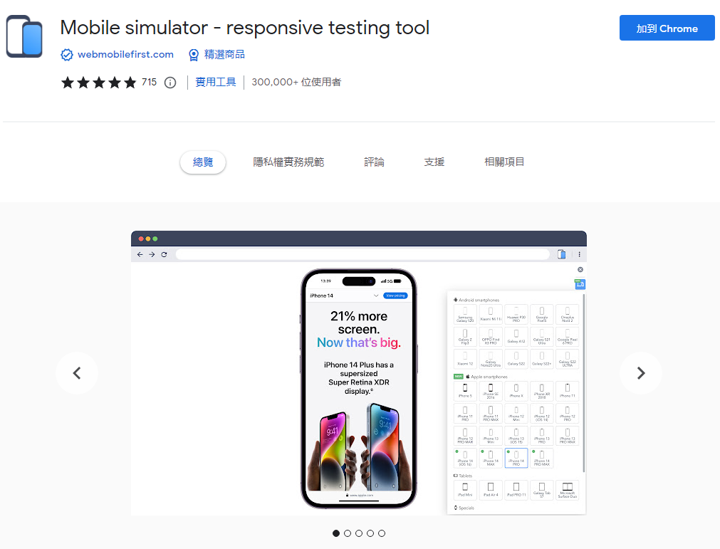 Mobile simulator - responsive testing tool 在電腦上使用智慧型手機和平板電腦模擬器,配備多個型號,以測試行動裝置響應式網站。