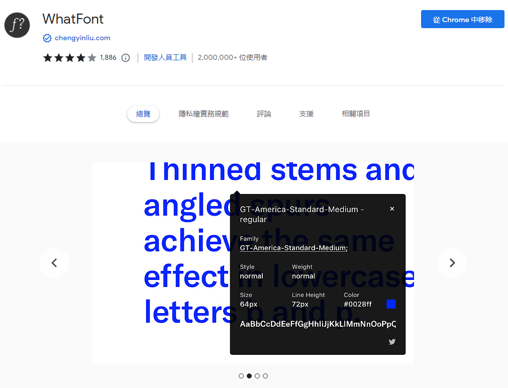 WhatFont 辨認網頁字體的最簡易方法,透過這個擴充套件,就算不是軟體工程師,你只需要將滑鼠游標放在字體上,就可以簡單優雅地檢視網頁字體。 它也可以偵測用來服務網頁字體的服務。支援 Typekit 和 Google Font API。