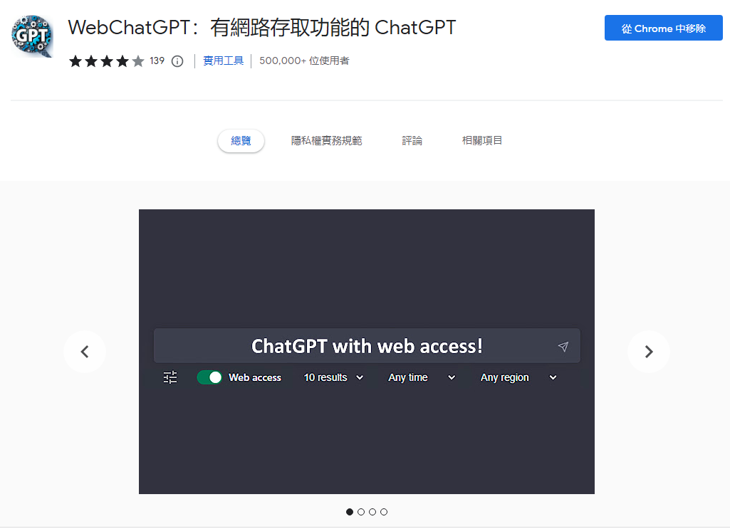 WebChatGPT:有網路存取功能的 ChatGPT 顧名思義,增加了連網的功能可以存2021年之後來自網絡的相關結果,並增加 ChatGPT 的回答的來源網址。
