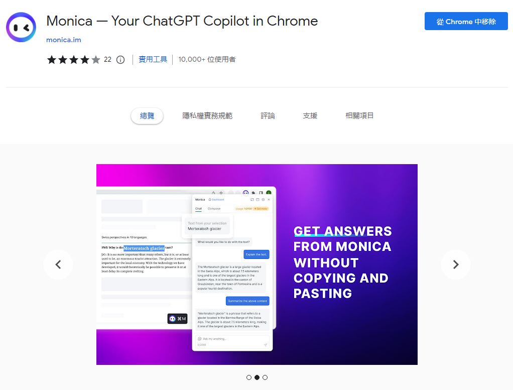 Monica — Your ChatGPT Copilot in Chrome 🚀就像是一款內建在瀏覽器中的ChatGPT,只需按 Cmd M 或 Ctrl M 即可開始與 Monica 聊天。 翻譯、改寫和解釋任何網頁上的任何文本。無論您身在何處,所有網站均可用。